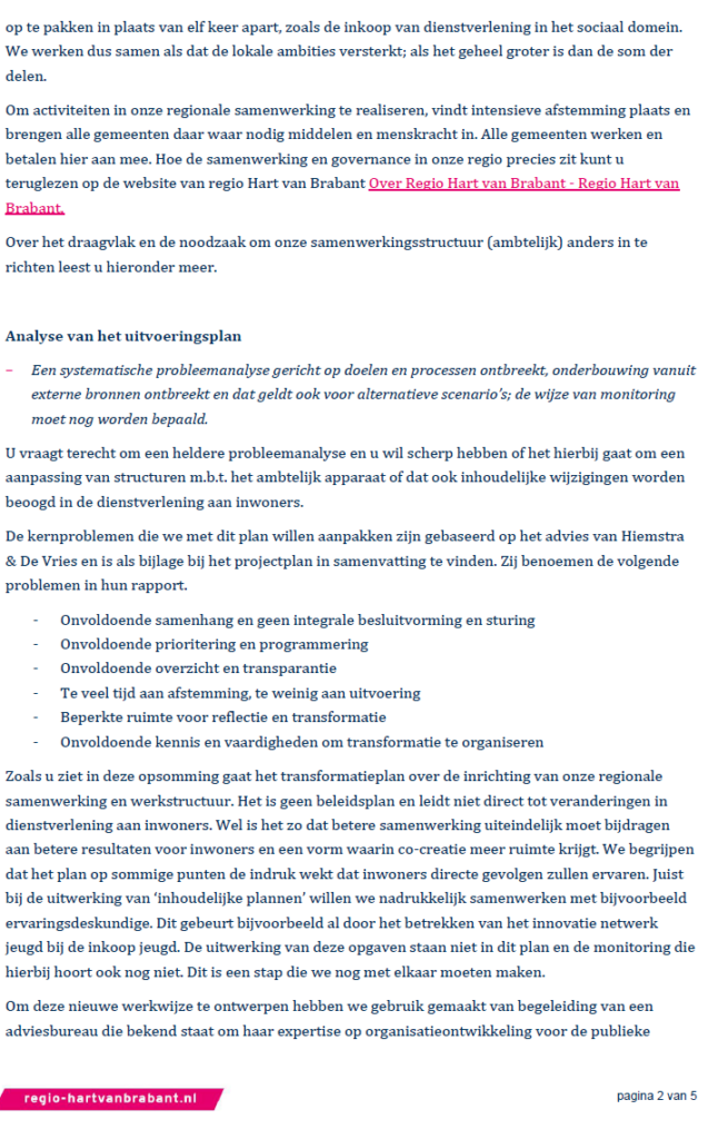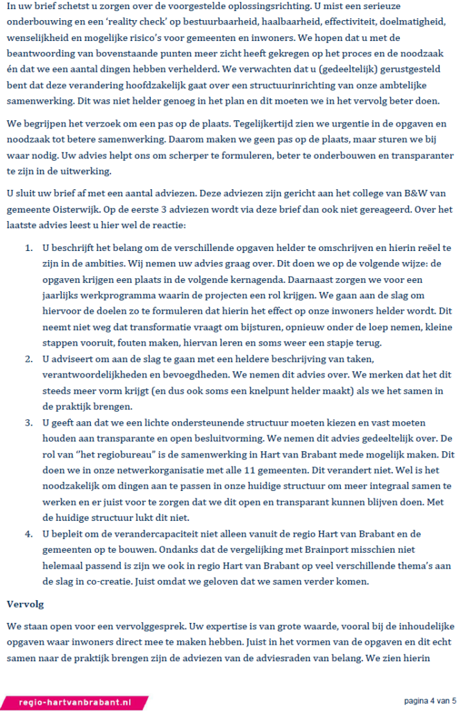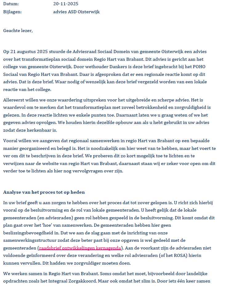 Reactie advies transformatieplan Berichtauteur Door P.T.J. (Piet) Thomassen Berichtdatum 27 april 2026 Door Regio Hart van Brabant ← Brief aan de formateur en de politieke partijen in Oisterwijk → Reactie op ongevraagd advies van ASD d.d. 21 augustus 2025